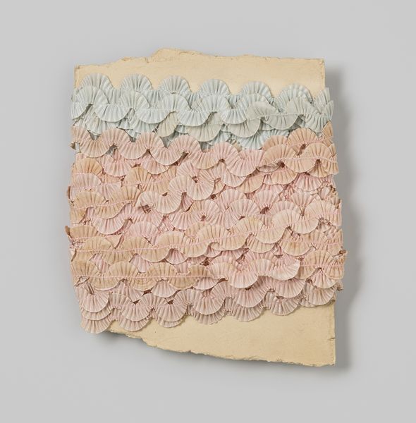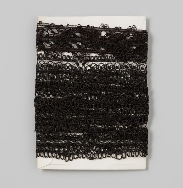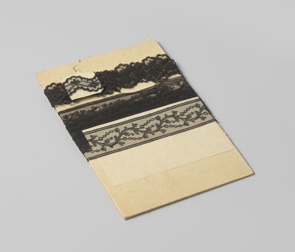 Editor: Here we have "Strook van zwart kant met getande rand," or "Strip of black lace with serrated edge," from around 1920. It’s currently held at the Rijksmuseum. It’s… a strip of lace, obviously. What jumps out at me is the geometric pattern. What can you tell me about it? Curator: Well, it's a fragment, right? Displayed on a neutral ground. I find myself immediately considering the socio-economic implications of lacemaking at the time. Early 20th-century lace, while often associated with luxury and femininity, was frequently produced under exploitative labor conditions. The geometric abstraction, although beautiful, may have distanced the wearer from the realities of its production. Who made this? What were their circumstances? Editor: That’s a sobering perspective. I was focusing on the zigzags, which, I guess, give it a kind of “modern” feel. Curator: Exactly! The move towards abstraction in decorative arts coincided with major shifts in women's roles and expectations. So the geometry also allowed this lace to participate in these broader dialogues about industrialization and shifting societal norms. It isn’t “just” lace. What kind of women wore these styles, and why? Editor: It’s amazing how much social history is embedded in such a small piece of fabric. I’ll definitely be thinking about the maker, and not just the design, next time I look at lace. Curator: It’s about recognizing the silent voices interwoven into the artwork, challenging us to confront uncomfortable truths about production and consumption. This changes how we see and experience art.