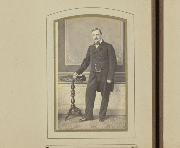 Editor: Here we have Robert Jefferson Bingham’s "Portret van de heer Poujade," an albumen print dating to around 1860-1865. It’s fascinating to see this early form of photography. What strikes me is the stiff pose and the inclusion of what looks like very ornate furniture. What can you tell us about it? Curator: It's compelling to consider the materials and processes that led to this image. Albumen prints required a meticulous coating process, each stage demanding specific expertise. Notice, too, the staging—the subject posed next to elaborate furniture. It's not merely decorative; it speaks volumes about the sitter's aspiration and economic position. What does the choice of backdrop material tell us about the availability and cost of resources during this period? Editor: That’s interesting; I hadn't thought about the resources. It gives the piece a completely different depth. Was there an established industry for portrait photography by the 1860s? Curator: Precisely. Photography democratized portraiture, to some extent. Before this, painted portraits were largely limited to the elite. How does this new accessibility affect the art market and the role of the artist? Did it shift power dynamics in portraiture and, in the broader art world, by influencing what subjects people began seeing as important? Editor: It’s a huge change to have photography available to more people. It's easy to think of it just as an image, but the entire system around it required all of this work. Thanks for expanding my view. Curator: Indeed. The finished product we see here only hints at the complex web of labor, capital, and technological innovation that made it possible. Examining the 'how' helps us understand the 'why.'