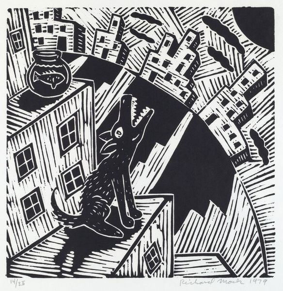Curator: Let's consider M.C. Escher's "Father with Magnifying Glass" created around 1920, an engraving printed via graphic art. The stark black and white contrast is striking. What catches your eye? Editor: Initially, I'm drawn to its geometric, almost puzzle-like quality. It's not a warm or inviting image, but rather cold and analytical. The hard lines and sharp angles create a sense of detachment. It feels very Modern. Curator: Indeed. Given its creation during the Interwar Period, after the widespread mechanization of the first World War, this focus on the mechanical construction is crucial. This period saw increased industrial production – how does Escher reproduce it here, in an age before mechanical reproduction techniques? The material contrast and clean delineation show the deliberate labor required for a clean print, almost flaunting it. Editor: And if we bring that industrialization back to the figure in the portrait, what labor and precarity exists there? I am interested in how that black backdrop might signify anxieties of the period about social mobility. What kind of father *is* he? Escher had difficult familial relationships, so is this a subtle, abstracted critique of paternity? Curator: Perhaps. The magnifying glass invites the viewer to consider not just the *subject* of the image, but the details and the labour inherent within it, foregrounding not just the content, but its mode of artistic construction. The negative space also creates this very same frame. Editor: Exactly. This pushes us beyond simple appreciation to understand the role art plays in shaping understanding. It becomes a dialogue about observation, labour, identity and even familial anxieties filtered through the lens of modernity. Curator: Ultimately, this is a useful challenge against romantic notions of "the artistic genius" for more transparent methods and models of material making. Editor: Definitely something to ponder as we leave the gallery. Thank you. Curator: My pleasure.