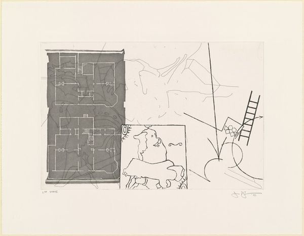 This is "The Seasons," a trial proof by Jasper Johns. It depicts a rabbit, ladder, and child's silhouette interwoven with abstract geometric shapes. The rabbit, a harbinger of spring, has ancient roots as a symbol of fertility and rebirth, seen in pagan rituals and later adopted in Christian Easter iconography. The ladder, a motif present throughout art history, from Jacob's Ladder in biblical lore to its appearance in surrealist paintings, symbolizes ascent and connection between earthly and spiritual realms. Johns' integration of the child's silhouette—a figure often associated with innocence—and geometric shapes introduces a layer of psychological complexity. These shapes are reminiscent of Leonardo Da Vinci's Vitruvian Man, which connects the human form with the order of the cosmos. Notice how these symbols resonate with ancestral memory, surfacing in myriad forms across eras, reflecting our deep-seated yearning for renewal, transcendence, and understanding of the human condition.