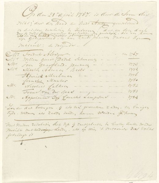 Curator: Oh my, doesn't that script just dance across the page? It's so alive! Editor: Indeed, what you're seeing is a drawing made with ink on paper by Jan Brandes, dating roughly between 1779 and 1785. The work is titled "Bescheiden van Jan Brandes: financiën en staat van bewoning Batavia." These are documents related to finances and residency status in Batavia, now Jakarta. Curator: Finances, hmm. Still, it looks like a score for a strange, celestial orchestra. All those rhythmic dips and swirls—does it mention anything interesting? Editor: It does. These are administrative records documenting transactions, related to people named Socta Wangsa and Aman Minge. Curator: It is oddly beautiful. Look at the angles meeting curves, how dense areas give way to blank space. It’s like a landscape of numbers. You could almost lose yourself in that geometry. What about these names, Socta Wangsa and Aman Minge - were they residents? Editor: Most likely they were local individuals involved in financial transactions with the colonial administration. The document speaks to the ways resources were managed—or perhaps mismanaged—in this colonial context. It offers a glimpse into the day-to-day realities of both colonizers and colonized, recorded in meticulous detail. Curator: So it is not merely administrative but quite political as well. Seeing how economics become art—almost by accident—is really incredible. Brandes never imagined we'd pore over his account keeping for its aesthetics! Editor: That tension is powerful, I think—the cold precision of colonial record-keeping imbued with accidental artistry. It pushes us to consider what survives from these periods, and who gets to decide what's deemed important, or beautiful, enough to preserve. Curator: Absolutely. What stories lie hidden beneath the beautiful calligraphy? It makes me wonder about those untold tales of Batavia, filtered through the meticulous hand of a colonial scribe. Editor: Perhaps art’s greatest value, then, lies in its ability to ask more questions than it answers, provoking reflections that transcend time and place.