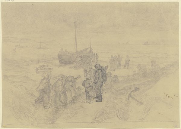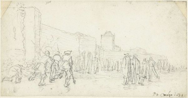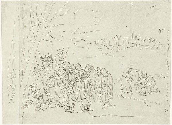 Jacob de Wit created this drawing, "Moses Chooses the Seventy Elders," using graphite in a landscape format. The drawing presents a bustling scene filled with figures under a lightly sketched sky and mountainous backdrop. The composition is divided into clear horizontal layers from the foreground with more solid ground up to the background mountains. De Wit's use of line is particularly striking. Lines are quick, gestural, and create a sense of movement and impermanence. The artist employs hatching and cross-hatching to create depth and shadow, although the overall effect is light and airy. The rapid sketch destabilizes the monumental nature of the biblical scene. The lack of precise detail invites us to fill in the narrative gaps. The lines themselves function as signs, indicating form and space with minimal detail. Here, the dynamism of the lines suggests a moment of transition and choice, highlighting the tension between individual agency and divine mandate. This work remains open to interpretation, and underscores how lines and composition contribute to the artwork's meaning.