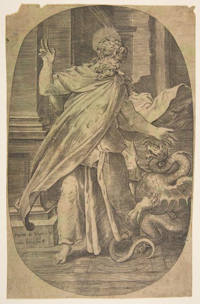 Giulio Bonasone created this print titled "Man met draak," now housed in the Rijksmuseum, using engraving techniques. The composition presents a striking contrast between the draped figure of the man and the scaly texture of the dragon. Bonasone's use of line is particularly compelling. Notice how dense, parallel lines create areas of shadow and volume on the man’s robe, while finer, curved lines define the dragon’s form. The use of an oval frame around the figures suggests a contained space, yet the dynamic poses of the man and dragon imply tension and potential movement beyond this boundary. This dynamic interplay between form and content speaks to broader philosophical concerns regarding the representation of power, divinity, and monstrousness. Through a semiotic lens, we might interpret the dragon as a signifier of chaos, subdued by the commanding gesture of the man. Ultimately, the success of this artwork lies in its ability to generate dialogue. It embodies a sophisticated engagement with visual language and ideological critique, inviting viewers to consider the complex interplay between aesthetic form and cultural meaning.