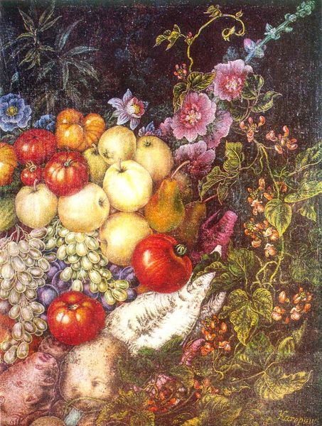 Curator: So, here we have Kateryna Bilokur's "Still Life: Flowers and Vegetables," painted in 1959 using oil paints. What's your first take? Editor: A symphony of abundance! It's bursting with the kind of raw energy I associate with harvest festivals, but painted with the meticulous care you might give a Renaissance portrait. Curator: Exactly! And consider Bilokur herself. A self-taught peasant artist from Ukraine, denied formal training yet producing works with this almost hyper-realistic detail. Editor: That lack of formal training speaks volumes, actually. It flies in the face of a patriarchal and Eurocentric view of what it means to be a creative, artistic subject, let alone who even qualifies as an artist. In a sense, her life and work disrupt those boundaries! Curator: Totally. The intensity is, well, defiant. Like she's saying, "Look at this humble bounty, made sublime through attention and devotion!" I feel as if each onion, beet, garlic... it's a miniature portrait, glowing. Editor: Speaking of glowing, let's not forget the socio-political context. Imagine this kind of cornucopia painted in the late 1950s in Soviet Ukraine, barely recovered from the Holodomor. Curator: You're right. It's not just beauty; it's a survival song, almost. Editor: An assertion of life and resilience through the quiet defiance of everyday subjects like these flowers, garlic bulbs and vegetables. This wasn't a "simple" still life; this was visual resistance, especially in Ukraine's landscape. Curator: Makes you think about how often beauty is its own quiet rebellion, right? And perhaps Bilokur found that power within the very things that sustained her community. Editor: Absolutely. The piece becomes a celebration, then, of what it means to survive and find beauty against all odds. It invites us to ask: What is being depicted here and for what purpose? Curator: Food for thought indeed, both literally and artistically! Editor: Precisely. A garden of defiant joy!