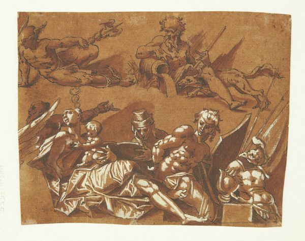 Giovanni Domenico Tiepolo made this spirited drawing of “Cupid Blindfolded, Carried Through the Sky by Seven Winged Putti” using pen and brown ink, with brush and brown wash, over black chalk on paper. The artist’s hand is evident in the confident strokes that define the figures. The brown wash, applied with a brush, adds depth and shadow, creating a sense of movement as the putti struggle to carry the mischievous Cupid. Notice how Tiepolo uses the translucency of the ink to model the forms, allowing light to pass through thin washes and be absorbed by darker, more concentrated areas. This was not just casual; it was about generating an ethereal quality. Tiepolo’s technique reflects the traditions of Venetian draftsmanship, combining careful observation with a flair for the dramatic. The rapid, fluid lines suggest a mind working quickly, capturing a fleeting moment of classical exuberance. Yet, in this apparent lightness of touch, there’s also a deep understanding of the materials and processes at hand. It’s a reminder that even the most effortless-looking art is the product of careful labor, of choices made and skills honed. Ultimately, it shows us that the boundaries between craft and fine art are often artificial, obscuring the true nature of creative work.