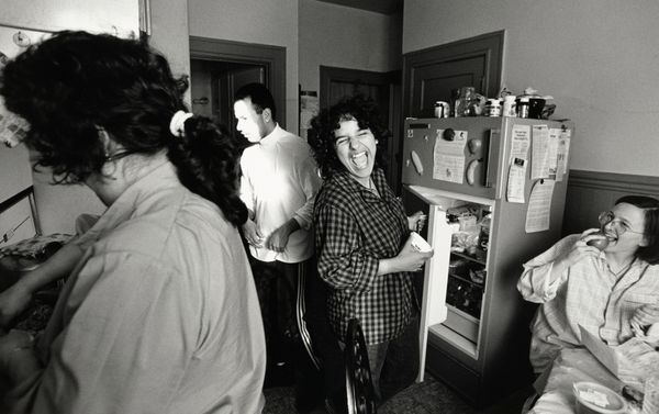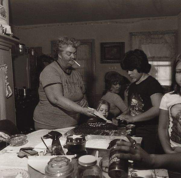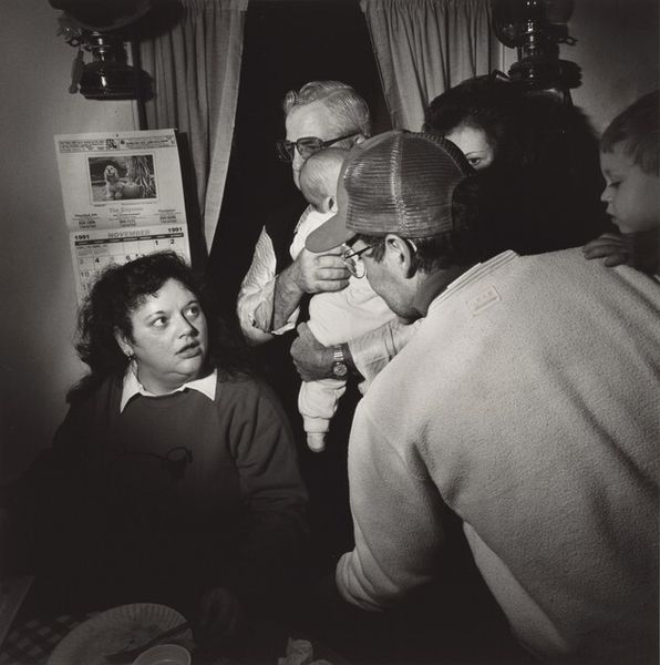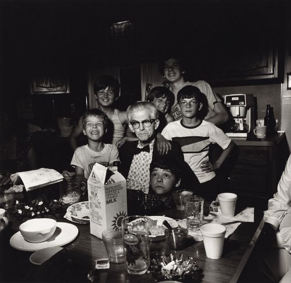 Editor: This gelatin silver print, "Pat Sabatine’s Eleventh Birthday Party" by Larry Fink, feels so raw and intimate. The figures seem caught in a moment. What significance do you see in these everyday scenes? Curator: Fink uses the birthday party, a celebration of life and continuity, as a stage for deeper symbols. Note the Taurus t-shirt; it speaks to groundedness, perhaps stubbornness. Does it suggest anything about the person wearing it, or their role within this intimate setting? Editor: That's interesting. I hadn't considered the t-shirt as anything more than casual wear. Curator: Consider, too, the quality of light and shadow. It hints at vulnerability, shared histories. These aren't just portraits; they are visual echoes of lives lived and the cultural memory they hold. Editor: I see it now. The photo's realism captures a complex emotional landscape. Curator: Indeed. Fink reminds us that even in the mundane, potent symbols reside.