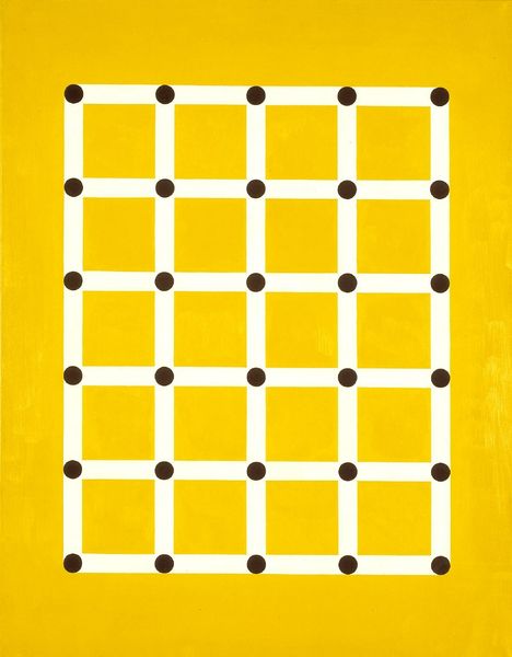 Editor: Here we have Thomas Downing's "Rivet Lilt" from 1962, a field of painted circles. There's something quite mesmerizing about the regularity and color choices. What's your take on this work? Curator: It’s important to consider Downing's methods. His use of stencils to create these perfect circles—what does that process tell us? Are these handmade paintings or are they mass produced objects? How does this fit into a larger context of art and manufacturing? Editor: It feels almost… industrial, with that perfect repetition. Curator: Exactly. Think about the socio-economic backdrop of the 1960s: the rise of consumerism, mass production. How does Downing, through the *act* of painting something that resembles something machine-made, challenge those notions or maybe reflect them? What commentary might Downing be making on the labor involved, or perhaps, not involved, in the traditional artmaking? Editor: So it's less about what the painting represents, and more about how it was made and what that making says about the culture it came from? Curator: Precisely. Think about the "materials" here too. It's not just paint and canvas, but also stencils, the tools that enforce uniformity. He is investigating not just making but the act of replicating. And how this relates to industry and consumer culture. Editor: That gives me a new appreciation for it. I was focused on the colors and pattern, but now I see the commentary on labor and mass production. Curator: Thinking about art as a product of material conditions and production processes opens up exciting ways to understand works like this, doesn’t it?