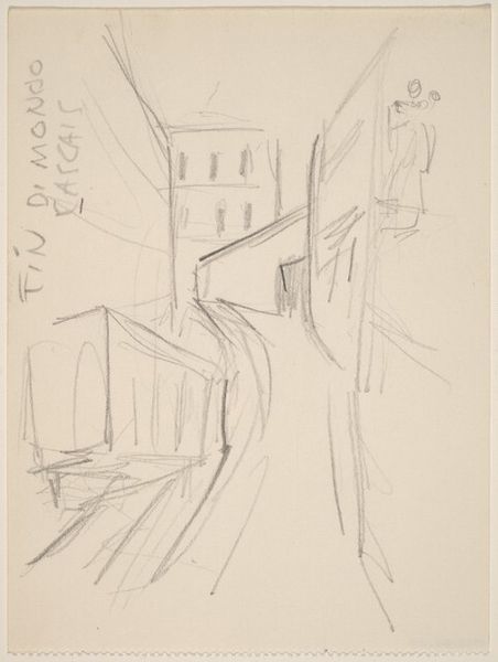 Curator: Here we have "Street Scene" by Louis Lozowick. The artwork, executed in pencil, offers a glimpse into urban life through the lens of the Ashcan School movement. Editor: Hmm, it feels like a ghost city. Like all the stories have been washed away by the rain, and all that's left is this skeletal structure of buildings reaching up. Eerie, in a way. Curator: That’s a compelling reading. Considering the Ashcan School's focus on representing everyday life, particularly in working-class neighborhoods, we can read Lozowick’s "Street Scene" as a statement on urban existence, filtered through abstraction. The sketch emphasizes geometric forms which contribute to a stark, possibly alienated view of city life. How does that read against your initial reaction? Editor: Well, that makes it even more poignant! The loneliness and isolation that jump out might be a product of the period when urban realities started shifting radically. A lot of these early 20th century artists capture a tension between the excitement of new technologies, new infrastructure, and a creeping sense of displacement, don’t you think? It almost feels like a premonition in graphite. Curator: Exactly! By examining Lozowick through theoretical frameworks centered around modernity and alienation, one can argue the artist used abstraction to highlight the fragmenting experiences of individuals within rapidly evolving urban landscapes. The lines almost suggest fractured narratives. Editor: I like the "fractured narratives" bit! It also just looks cool—the pencil lines create shadows that sort of move, depending on the angle of light hitting it. Does that sound too woo-woo? Curator: Not at all. Personal connection is essential, and indeed, that interplay of light and shadow may further echo the complex relationships that urban dwellers negotiate, emphasizing themes of visibility and invisibility, presence and absence, within city spaces. Editor: Absence is what really lingers with me here. It makes you wonder about all the things the drawing *doesn’t* show—the faces at the windows, the sounds of the street, the… life, y’know? Thanks for expanding my view; now, excuse me while I wander off to make my own ghosts. Curator: Absolutely. And I thank you for underscoring the resonance of personal narratives within historical context—how the sketch beckons viewers to complete what Lozowick only implies.