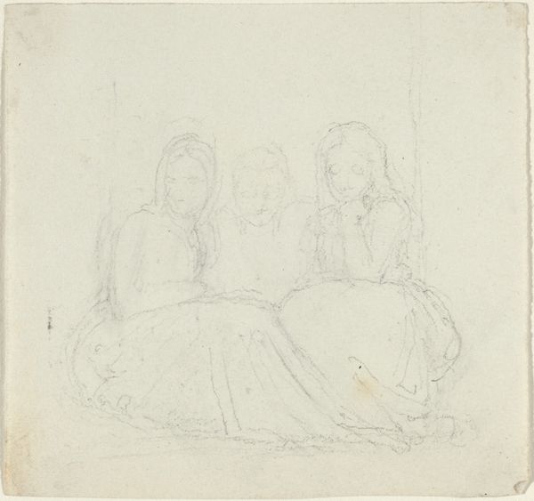 Editor: This is *Studieblad met Scheveningse visserskinderen*, a pencil drawing on paper made by Charles Rochussen sometime between 1824 and 1894, currently housed in the Rijksmuseum. There's something so intimate about a pencil sketch; it feels like stepping into the artist's personal sketchbook. What strikes me most is the emotional distance in their gazes. What do you see in this piece? Curator: I see a convergence of cultural memory and intimate observation. Rochussen captures the stoicism often associated with communities reliant on the sea. Look closely – how does the relative lightness of the pencil work contribute to their seemingly ethereal quality, almost like ghostly figures tethered to the earth? Editor: It’s like they are present, yet already distant, perhaps hinting at the perils faced by fishing families. I hadn’t considered the effect of the lightness in conveying that sense of transience. Curator: Exactly. Think about the symbolism embedded in their attire. Head coverings, for example, can denote both protection and constraint. Does their sameness amplify or diminish their individual identities, in your opinion? Editor: I think it amplifies it. It hints at how each has internalized social and cultural roles. It shows in their postures, don't you agree? The little one seems so weary... Curator: Indeed. Consider too, how Rochussen uses light and shadow not for dramatic effect, but to suggest a kind of emotional weight, a shared burden. This is about more than just depicting children; it's about representing a community's shared experience, generation after generation. What feeling remains with you? Editor: A poignant awareness of the cycle of life and the silent strength inherent within this community, translated into a subtle but potent visual language. It goes beyond a simple portrait. Thank you. Curator: And thank you. This careful attention to these elements is critical to experiencing cultural continuity throughout centuries.