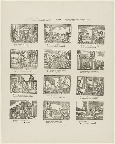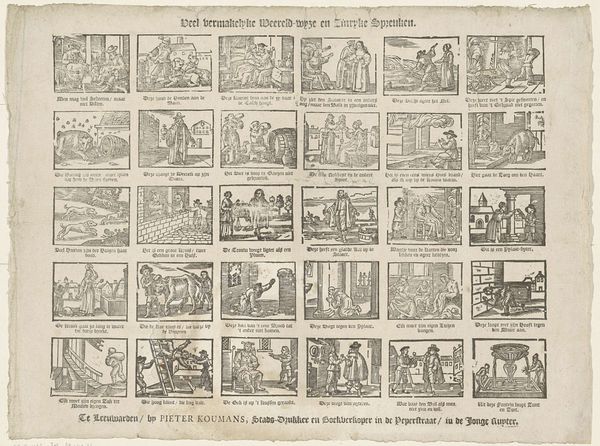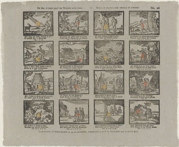This illustrated broadside, titled "Dees' bybelprent toont u 't aardsvaderlyk geslacht," was printed by weduwe C. Kok-van Kolm in Amsterdam. It is made using a process called engraving. The image is incised into a metal plate, likely copper. Ink is then applied and the surface wiped clean, leaving ink only in the recesses. This plate is pressed onto paper, transferring the design. The result is a series of sixteen scenes from the Old Testament, each with accompanying text. The lines are crisp and uniform, giving the print a precise quality that belies the skilled handiwork involved. Prints like this were relatively inexpensive and could be produced in multiples, making biblical stories accessible to a wider audience. The print medium allowed for easy distribution. In this way, the production of this artwork is tied to the rising commercialization of art and the spread of literacy in the Dutch Republic. We see not just religious education, but also the development of a visual culture driven by market demand.