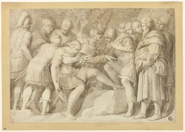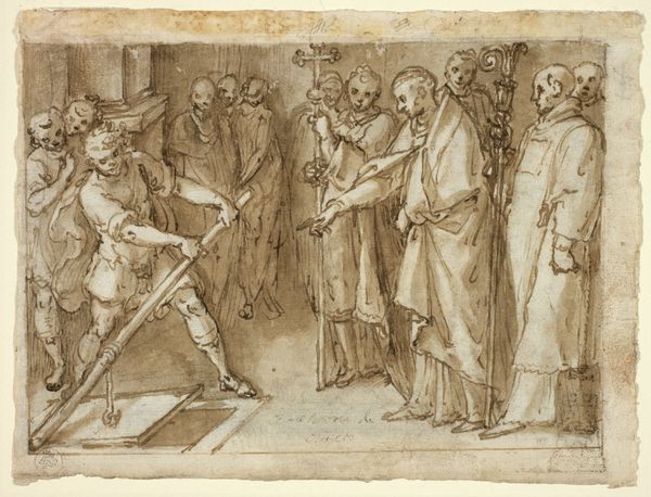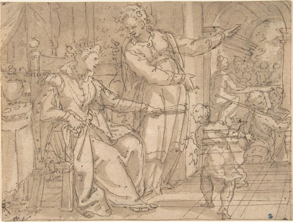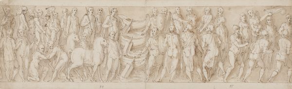 This drawing, of uncertain date and authorship, captures a theatrical scene with pen and brown ink on paper. The composition is a frieze-like arrangement of figures, each delineated with a fine, meticulous line that gives form and volume to the characters. The artist uses a relatively uniform line weight to define contours and interior details, resulting in a somewhat flattened picture plane. The scene unfolds with a central figure seemingly caught off guard, framed by a cast of characters whose expressions and gestures suggest a moment of high drama. The hatching and cross-hatching in the figures' clothing serve to model forms and create shadows, adding depth to the scene. However, the absence of a strong light source creates an ambiguous space, enhancing the surreal, dreamlike quality of the theatrical setting. The ambiguity invites us to question fixed meanings and explore the fluidity of identity within performance.