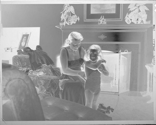 Editor: This photograph, "Untitled (people opening packages is newsroom)" by Lucian and Mary Brown, shows people opening packages in what appears to be an office. The negative image makes it feel ghostly. What stands out to you in terms of the process of creating this work? Curator: The reversal to a negative image immediately draws attention to the photographic process itself, highlighting the materiality of film and its development. How does this emphasis on the medium affect your interpretation of the "newsroom" setting? Editor: I hadn’t considered the medium that much, but it does make me think about the labor involved in capturing and developing the image itself, beyond just documenting the news. Curator: Precisely. The artists aren't just capturing an event; they're engaging with the means of production in a way that questions the perceived objectivity of photojournalism.