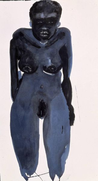 Editor: We are looking at a study by Edward Burne-Jones for his painting ‘The Death of Medusa I.’ It’s a chalk drawing of a nude figure, all in cool blue tones. The starkness of the figure against the blue background makes me think about isolation, like she's suspended in another world. What do you see in this piece? Curator: The effectiveness of Burne-Jones’s study hinges upon the formal contrast between line and ground, wouldn't you agree? Consider how the whiteness of the chalk, delicately applied, defines the contours of the figure, while the azure expanse behind establishes a serene yet detached field. Editor: Definitely, it's like the white figure is carved from the blue space itself. Curator: Precisely. Note the deliberate absence of a fully rendered face. The sketch privileges form over individual character. We find an emphasis on pure line and massing that evokes classical ideals. Semiotically, the work represents the body more as signifier than signified. Editor: So the point is less about Medusa specifically and more about the ideal human form? Curator: It would seem the artist wishes us to engage more deeply with pure form and abstract line. Further inquiry of composition brings one to that end. One must inquire - does not the absence prompt our engagement in decoding what she may signify? Editor: That makes sense. I hadn't considered how much the *lack* of detail could add to the piece. Curator: In prioritising pure aesthetics, Burne-Jones elevates his sketch from a mere preliminary study into a meditation of formal elements, thus creating new meanings that allow us to re-interpret the figure with our own codes. Editor: So by stripping away so much, the study actually communicates more. It focuses attention and creates layers of possibility. Curator: Precisely, such attention reveals what we could miss, in favor of appreciating the aesthetic value in pure form.
