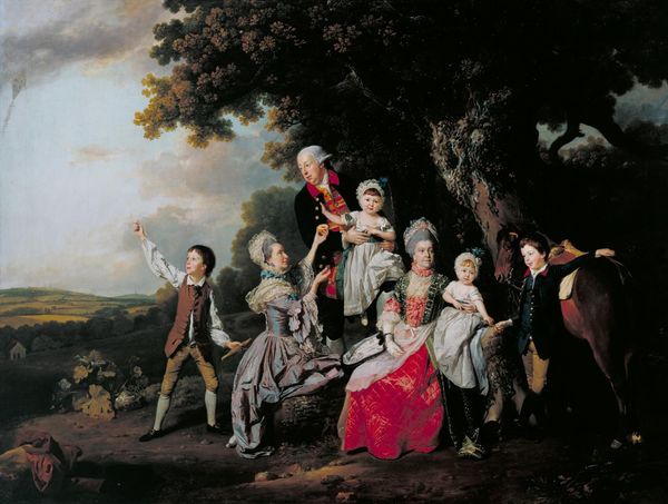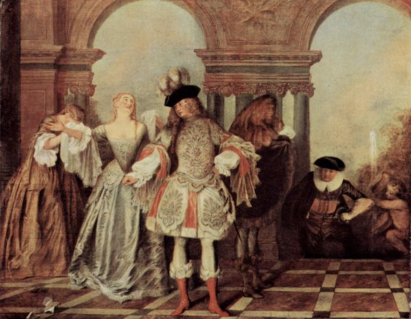 Curator: Hogarth’s 1745 oil painting, "Visit with the Quack Doctor", currently residing at the National Gallery in London, provides a fascinating snapshot into the social landscape of the 18th century. Editor: It's cramped, isn't it? Visually dense. Like stepping into a rather unsettling puppet show, with expressions ranging from theatrical to just plain queasy. What's your immediate read? Curator: Immediately I’m drawn to how the work serves as both social commentary and narrative art. Hogarth, a master of visual storytelling, satirizes the medical quackery prevalent at the time. He was quite interested in art that served a civic function. Editor: Absolutely! The charlatan's confident demeanor next to the clearly distressed young patient - classic Hogarthian irony. I love that the patient is holding her face; you instantly imagine how painful whatever she’s getting is. You can almost feel it. Curator: Exactly. Notice also the props. The skull, for example, a blatant symbol of mortality used to deceive patients. The interior décor tells us a lot too – a somewhat theatrical space for elaborate performance. We have to remember, healthcare wasn’t regulated the way it is now, so spaces like these were quite popular, even sought after. Editor: Performance is the key word. Look at the quack's assistant – seemingly unaffected. It heightens the sense of unreality, a carefully staged deception. It’s almost absurdly baroque with how it uses that style to build up to something so mundane and unpleasant. Do you think this moralizing works? Curator: Undeniably. By exaggerating the scene, Hogarth offers pointed social critique of fraudulent medical practices but it’s much more nuanced. The social hierarchy present at the time allowed these men to swindle members of society, and by using oil paint, a refined and academic medium, the critique really sticks its landing. Editor: Well said. And, honestly, revisiting this, the color palette keeps pulling me in. That murky tonality... It speaks of something unsettling lurking beneath the surface. Makes you question what kind of societal "cures" we still swallow down today. Curator: Precisely. Hogarth's painting endures because it's not just a historical document but also a timeless reflection on human folly and deceit, presented here with wit and impressive technical skill. Editor: Yes, "Visit with the Quack Doctor" leaves me both amused and unsettled – quite the concoction, and one that certainly sticks with you.