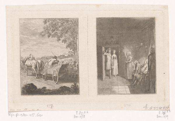 Curator: Here we have Daniel Nikolaus Chodowiecki’s "Twee voorstellingen uit de verhalen van Wilhelm Gottlieb Becker," created in 1797. It's an engraving, offering a fascinating glimpse into late 18th-century aesthetics. Editor: Oh, what a captivating little diptych! The moment I lay eyes on it, I feel like I’m peering into the dreams of an Enlightenment scholar – delicate, detailed, almost ghostly in its monochrome palette. Curator: Indeed. Note the careful rendering of space. The print employs line and stipple engraving techniques, establishing depth and volume. Chodowiecki’s structural precision is apparent in both panels, offering a comparative study of indoor and outdoor scenes. Editor: Right, it's almost a study in contrasts, isn’t it? One scene seems like a genteel domestic drama under a canopy of leaves, a gathering of refined individuals—perhaps a consultation or a heartfelt farewell? While the other pulsates with an almost urgent, romantic flight into the wild woods. One world ordered, the other impulsive and wild! Curator: Precisely! The engraving exemplifies a blend of genre and history painting—two narratives, possibly allegorical, playing against one another. I'm intrigued by how the figures adhere to a schema that allows for clarity of gesture, if not true emotion. The viewer decodes these cues for greater insight. Editor: The linear grace is so perfectly poised. Still, it has a curious distancing effect, doesn’t it? I mean, even with what appears to be quite emotional scenes playing out, the whole thing almost floats away, as if existing more as a reflection than as reality. You get a profound sense of longing. I want to know their story, their passions and yearnings! It teases the narrative senses to no end. Curator: It begs to consider the narratives' construction and the interplay of forms and subject matters, allowing a multi-layered reading from social commentary to historical interpretations. Chodowiecki asks the viewer to consider how the microcosm and macrocosm interact through formal organization. Editor: It’s like stumbling upon snippets from a long-lost diary! One thing’s for sure—art like this really makes you dream up your own stories about the stories within, doesn’t it? Beautiful and quietly stirring. Curator: A fitting testament to the lasting power of well-crafted engraving, provoking inquiry well into the 21st century.