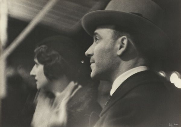 Editor: This is "Two men--San Francisco," a 1956 gelatin silver print by Robert Frank. It's struck me how intimate yet distant it feels, almost like eavesdropping on a private moment. What stands out to you from a formal perspective? Curator: The composition is built around the juxtaposition of textures. The smoothness of the foreground figure's bald head is echoed by the soft felt of the hat in the background. Contrast this to the patterned fabrics of their jackets. Consider how the differing focal points—one sharp, one blurred—contribute to a sense of depth and perhaps emotional distance. How do you perceive that manipulation? Editor: It's interesting. The way Frank directs the viewer's eye using focus really dictates what's important, the man with the cigar being prominent versus the mystery of the other man’s face, shielded by his hat. Does this have anything to do with semiotics? Curator: Precisely. The cigar acts as a signifier, directing the audience’s eye while suggesting wealth and status. Moreover, consider how Frank intentionally frames his subjects. Is the asymmetrical composition an attempt to create a deliberate disjunction or tension within the photographic space? What theoretical understanding could describe that tension? Editor: I hadn't thought about that. The unevenness makes it feel less staged, maybe more realistic. So, focusing on how all the pieces of an image function on their own as signifiers helps us see its deeper structures? Curator: Indeed. The brilliance of the work rests not just on the literal representation, but on its manipulation of visual language. Now consider other works from "The Americans" - how consistent is this form? Editor: I'll have to compare them! Thinking about art in terms of how it uses structure, shape, texture opens up a whole different way of understanding it. Curator: Yes, seeing these works is transformative as we move away from just ‘seeing,’ toward close reading.