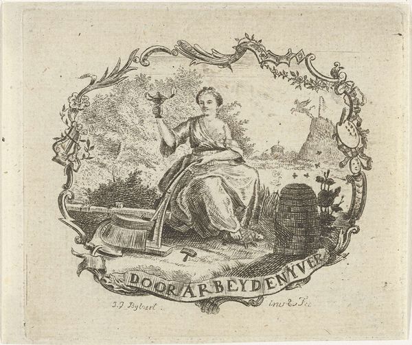 Curator: So, here we have "Patriots vignet, 1795," created by Johannes Jelgerhuis. It's an etching and engraving, currently residing at the Rijksmuseum. It almost whispers history, doesn't it? Editor: It does! It feels so delicate, almost like a faded dream. All those symbols... a woman in classical garb, a cannon, even a rooster. It makes me think of a history textbook illustration, but far more intriguing. How do you interpret this work? Curator: For me, it's a peek into the tumultuous spirit of the late 18th century. Think about the French Revolution rumbling in the background. This isn't just decoration, it is brimming with meaning, wouldn't you say? The figure, perhaps a symbol of liberty, holding the shield and that peculiar rooster - representing watchfulness or maybe even defiance? And that broken chain, lying so helpless next to a very anxious looking canine - doesn’t that evoke a sense of liberation after a struggle? Editor: Absolutely! Now that you mention the rooster, I see a bolder statement. What about the cannon and cannonballs? Are they more straightforward, symbolizing power? Curator: Exactly, power, and perhaps a subtle threat, a reminder that freedom comes at a cost. But it's not aggressive, more like a quiet resolve. Editor: It's amazing how much complexity can be packed into such a small, subtle piece. It shows how everyday objects can be imbued with layers of meaning in tumultuous times. Curator: Precisely. Art doesn't always have to shout to be heard, does it? Sometimes the most powerful statements are whispered.