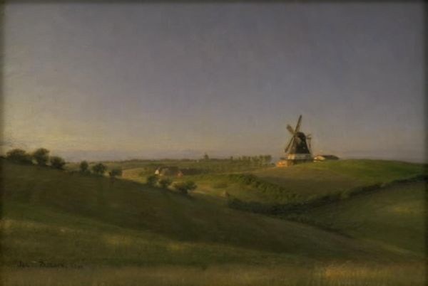 Editor: This is "Fog," painted by Caspar David Friedrich around 1830, currently housed in the Kunsthalle Hamburg. It looks like an oil painting. The pervasive muted palette is making me feel somewhat melancholic. The haystacks in the lower center ground also seem strangely dominant, in competition with the grand sky. What is your perspective on how its composition speaks to its overall message? Curator: The key here is the structure—or rather, the structured ambiguity. Note the gradation of tones, from the saturated foreground to the dissolving background. Friedrich creates a sense of depth, of course, but it is a depth that paradoxically obscures. Do you notice how the various horizontal bands—the green field, the fog-laden middle ground, and the clouded sky—compress the pictorial space? Editor: Yes, that is interesting. I initially saw the haystacks as somewhat out of place in the landscape, but now I can appreciate how they also play a compositional role by blocking and guiding the gaze. Curator: Precisely! They function almost as repoussoir, yet their muted colors prevent them from fully assuming that role. The artist employs this calculated restraint to create an evocative, rather than declarative, effect. Note also the numerous small birds that echo each other within the cloudscapes and horizon; their repetition speaks to ideas concerning perspective and mirroring. How might these avian groupings impact the work as a whole? Editor: That's such a clever point. I didn't fully notice how strategically birds are distributed and clustered; by doing so, I think Friedrich is contrasting freedom with constriction by their dispersion within nature. This formalist analysis has given me an entirely new understanding of this fog-laden painting. Thank you! Curator: It is through analyzing the work’s internal structures and its unique perspective that its complexities start to emerge. I’m happy you found this fruitful!