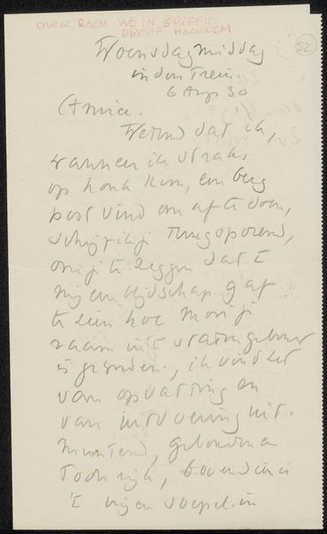 Editor: So, this is "Brief aan Willem Bogtman" by Richard Nicolaüs Roland Holst, created around 1922. It’s a mixed-media piece, ink on paper I think, held at the Rijksmuseum. At first glance, it looks like a simple handwritten letter, almost like a casual note, but the calligraphy has a distinct modernist flair. What strikes you about it? Curator: You know, it whispers to me of intimacy. A personal moment frozen in ink. It feels like eavesdropping, doesn't it? I see the familiar curve of the handwriting, the quirks of expression caught in each letter...Do you read it as merely informational, or does the rhythm and character of the script itself convey something more? Editor: I think it does, it almost feels like it’s meant to be more than just read. It’s decorative, in a way? The hand lettering looks considered. Almost geometric. Curator: Precisely! Roland Holst wasn't simply writing a letter; he was crafting a visual experience. The letter becomes an artwork in its own right. There is rhythm. Line weights contrast the empty space. Modernism toyed with blurring those lines, challenging how we experience art and life, even mundane tasks like letter-writing. Editor: I hadn’t considered how intentional the writing itself could be. I was so focused on the message, but it's clearly the medium too. Curator: Think of calligraphy not just as beautiful writing, but as a dance, a visual music, composed of line and form. It’s a lovely reminder that beauty exists in the most unassuming places. Editor: Absolutely, I’ll definitely be looking at handwriting differently from now on. It is much more intimate, I see that!