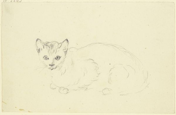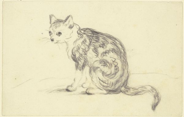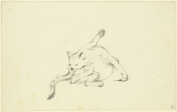 Friedrich Wilhelm Hirt made this drawing of a grooming cat with graphite on paper. Here, the artist coaxes out the feline form through the intimate act of drawing. It's rendered with soft, almost tentative lines that capture the cat's posture and texture of its fur. The choice of graphite as a medium is significant, its accessibility and immediacy allowing for the free expression of form, and encouraging a sense of closeness and authenticity. Graphite's powdery nature enables subtle gradations of tone. See how Hirt uses these tonal shifts to create a sense of volume and depth, giving life to the animal on the page. The intimate scale of the drawing brings a unique perspective, a challenge to traditional academic methods. With its modest materials and focus on an everyday subject, it offers a glimpse into the artist's world, inviting us to connect with both the subject matter and the process of creation. Ultimately, it reminds us to look closely, appreciate the subtle beauty of the material, and respect the artist's hand.