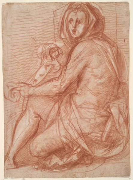 Curator: Here we have William Holman Hunt's "Study for the Christ Child in the Virgin's Arms for 'The Triumph of the Innocents' (first version)," currently held in the Tate Collections. Editor: It’s delicate, tentative even, with those faint lines sketching out the forms. A feeling of vulnerability permeates the composition. Curator: Absolutely. Hunt, a Pre-Raphaelite, often explored religious themes, and this drawing provides insight into his process. The positioning of the figures, the Virgin’s protectiveness, all speak to the biblical narrative. Editor: The materiality itself suggests a study, an exploration of line and form over finished polish, allowing us an intimate glimpse into Hunt’s artistic process. The rapid lines imply the dynamism of the holy scene. Curator: Indeed. The absence of vibrant color focuses our attention on the underlying structure and emotional resonance. Hunt's focus on religious subjects reflects the Victorian era's interest in moral narratives. Editor: Seeing the Virgin's closed eyes, the downward tilt of her face, it feels heavy with the weight of what's to come. Curator: A poignant perspective. Ultimately, it’s in these subtle, preliminary studies that we grasp the essence of Hunt’s artistic vision. Editor: A thoughtful glimpse behind the curtain, then.