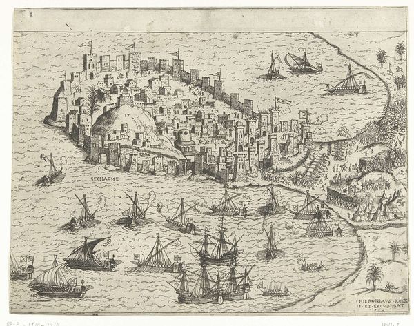 Editor: This is "Schipbrug van Parma over de Schelde opgeblazen, 1585" by Frans Hogenberg, an engraving from 1588 here at the Rijksmuseum. The sheer detail in rendering the exploding bridge is fascinating, almost gruesome. What's your take on it? Curator: Well, first off, it’s an engraving. Hogenberg wasn’t just illustrating; he was crafting a political statement through material means. Printmaking allowed for the mass production of this image, distributing a specific narrative widely. Editor: A political statement? What do you mean? Curator: The image depicts the destruction of a ship bridge during a time of war. Consider the labour involved in creating and destroying such structures. It highlights the cost—both human and material—of conflict. It speaks to the instability of power, how infrastructure can be both built and demolished to control resources. Look at how Hogenberg represents the explosions—almost ornamental, obscuring the actual violence. It almost feels like… propaganda. Editor: Propaganda, using printmaking? Curator: Precisely. The choice of engraving made it accessible. Hogenberg transformed the material reality of war into a consumable image, shaping public opinion through a careful manipulation of medium and subject. Consider who commissioned the print, and for what purpose. What audience was this made for, and what was its likely impact? Editor: That really shifts my understanding. I was focused on the "art," but you've made me realize this isn't just an image; it's a product of labor, materials, and deliberate social action. Curator: Exactly! Understanding art through a material lens invites us to question how it functions within power structures. It opens up avenues of inquiry beyond aesthetics alone, considering consumption, distribution, and intended manipulation.