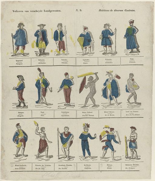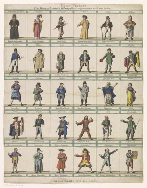 Curator: At first glance, I see what appears to be a theatrical cast, perhaps puppets on a stage awaiting a grand production! The composition is so ordered. Editor: Well, let’s pull back the curtain, shall we? This drawing, crafted between 1832 and 1850, is entitled "Ten Figures in Historical Clothing." The hand of Theodorus Johannes Wijnhoven-Hendriksen brought it into being with pen on paper, and you can find it here at the Rijksmuseum. What draws your eye, specifically, to the idea of theatre? Curator: It's the symbolism in their costumes and poses; each figure is a stock character. The stern soldier, the distraught maiden, the laborer with his pipe—archetypes ready to play out age-old narratives. They remind me of shadow puppets, in their flat presentation and outlined figures. It evokes cultural memory and continuity. Editor: That’s a fascinating way to interpret them. Considering the period in which Wijnhoven-Hendriksen created this, I wonder if these weren't simply depictions of social types encountered in daily life, aiming to document rather than stage some grand performance. Curator: Perhaps! Yet, there is an inherent performance in documentation. To select, pose, and portray these specific individuals suggests an agenda, a curated view of society. And note the slight stylization; it edges towards romanticism. Even mundane activities like smoking or gesturing become symbolic when placed under an artist’s gaze. Editor: I agree that Wijnhoven-Hendriksen is certainly making choices, constructing a social image rather than mechanically copying reality. But how does one discern, definitively, the symbolic weight versus the sociological record? I guess we are left to observe and wonder at the cultural values which elevate simple depictions to artistic objects. Curator: Precisely! That interplay between documentation and artistic intention makes this piece so compelling. What stories can we glean from these depictions? And what societal narratives have endured? Editor: Well, it’s certainly given me a broader perspective on the power dynamics embedded within seemingly simple character sketches. I appreciate the way you’ve revealed the hidden symbols. Curator: And your historical context allows us to imagine a world that once held very different meaning for these types, these clothes, these characters. A rich discussion indeed.