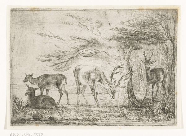 Jan Bos Wz. created this artwork, “Bosrand met herten”, which translates to “Edge of the Woods with Deer," using etching techniques. At first glance, one is struck by the artist's skill in using line and shadow to create depth and texture, especially in a monochromatic palette. The composition is carefully arranged to lead the eye from the foreground, where a group of deer rests, to the more dense and darker background. The contrast between the open, illuminated space on the left and the darker, wooded area on the right creates a visual dynamic. Bos's use of line suggests an engagement with the ideas around naturalism, popular at the time, where there was an emphasis on the accurate and detailed representation of the natural world. The formal elements here work together to create a structured and contemplative scene, that invites viewers to observe the relationship between light and shadow, form and space. The artist's technique, though seemingly representational, also reveals an interest in exploring the expressive capabilities of the etching medium.