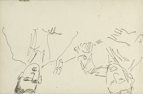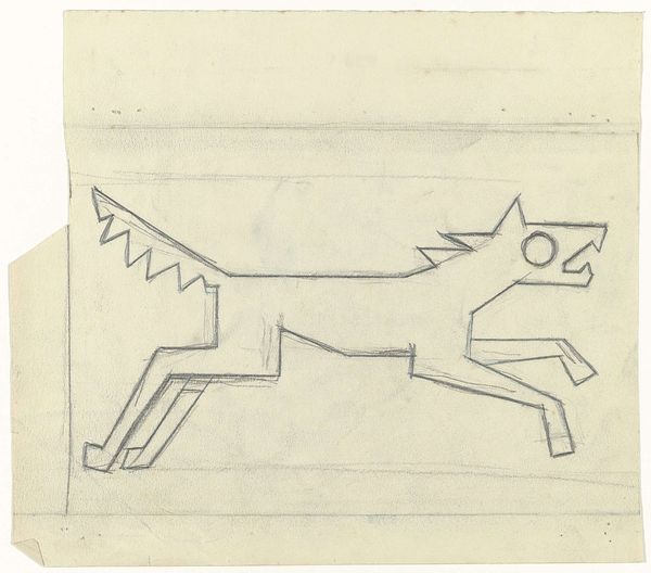Curator: This is Reinier Willem Petrus de Vries' "Studieblad met paarden en vleugels", a pencil drawing dating between 1884 and 1952. Editor: It's a rather intriguing drawing; the sketch-like quality, along with the unusual blocky style and the contrasting presence of wings, create an interesting effect. How do you interpret this work? Curator: Primarily, I engage with its formal qualities. Observe how the artist employs line – stark, utilitarian – to define the subjects. The reduction of forms into almost geometric components suggests an exploration of structure rather than representational accuracy. It adheres to structuralism by revealing the intrinsic order of form. What compositional relationships do you perceive? Editor: Well, there’s a juxtaposition of natural and unnatural, like the anatomically blocky horse beside what appears to be stylized wings. Are you saying the contrast between realistic and abstract shapes contributes to its meaning? Curator: Precisely. It directs our gaze to the materiality, or what is represented and how, and it seems the subject matter is second to the study of form, wouldn’t you agree? Consider the visual tension between the fluid curves of the wings and the rigid, angular lines composing the horses. Editor: I see that now. The wings offer a softness that contrasts the harsh, block-like body of the animal, thus establishing a contrast. It seems a lot more methodical than my initial reaction. Curator: Indeed, viewing it through a formalist lens encourages an understanding beyond immediate aesthetics and unlocks a more academic and methodical engagement with the artwork’s qualities. Editor: This was extremely insightful, thank you. Curator: A rewarding exercise, indeed.