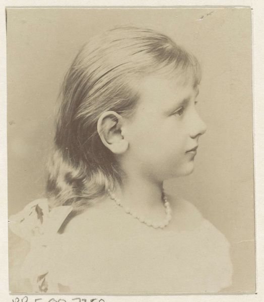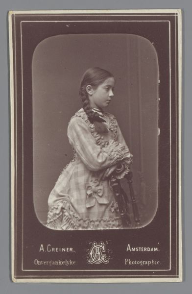 Editor: So, this is "Portret van Wilhelmina, koningin der Nederlanden," taken sometime between 1890 and 1895. It's a photographic portrait of the future Queen Wilhelmina, and what strikes me is the starkness of the photo. What do you see here, thinking about the materials and process? Curator: Well, the albumen print itself speaks volumes. We must consider how this portrait served a specific social function, right? It wasn't simply a personal keepsake. Look at the crispness the albumen printing process provides, which created a standardized, reproducible image for wide consumption. Editor: Reproducible for consumption, yes. So, was it less about artistry and more about, say, political communication? Curator: I think it’s both. See, albumen prints are a meticulous and laborious process, turning egg whites and silver nitrate into a light-sensitive emulsion. This painstaking craftsmanship shows a certain amount of care. How do you think that level of involvement intersects with the creation of royal imagery at the time? Editor: Hmm. So, there is skill required, then. The lace detail would require precise manipulation and development techniques. That dress couldn't have been easy to reproduce so vividly back then. That seems to blur the lines a little bit between mere propaganda and actual artistry. Curator: Exactly! And considering how Wilhelmina came to the throne quite young, the image is being carefully managed through very specific material means, influencing public perception of the monarchy. What do we make of that lace now? Think of where it was made, by whom, for whom... Editor: Interesting point. It certainly forces you to think beyond the surface level of royal portraiture. Thank you! Curator: A perspective change always has a way of expanding one's understanding of history and its portraiture.