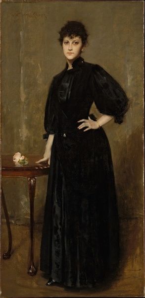 Editor: This is Whistler's "Green and Violet Portrait of Mrs. Walter Sickert" from 1886. It’s an oil painting, and I’m immediately drawn to the contrast between the dark dress and the pale face, there's almost a melancholy about her. What's your take? Curator: Oh, melancholy indeed. It’s as if Whistler captured a fleeting thought, a silent poem. See how he uses those muted greens and violets? Not a burst of color, but a subtle hum. Makes you wonder, doesn’t it, what stories those shadows could tell if they were to loosen their lips just for a moment? Editor: Absolutely, it’s very atmospheric. I’m curious, why the limited palette? Curator: Whistler was a master of tonalism. He thought colour should serve the overall mood. Each colour is used to amplify the rest of the piece and its intent, what happens in the eye, in the emotional gut, when light turns back on itself, you know? Mrs. Sickert, she becomes part of this harmony, a note in a symphony, don't you think? And I must ask, what feeling does her presence spark in you? Editor: I feel like she’s in her own world, not really engaging with the viewer. But maybe that's intentional, creating this intimate moment we’re just witnessing. Curator: Precisely! It is her reverie! This painting feels more like a whisper than a shout. Maybe, just maybe, Whistler wanted us to feel like we've stumbled upon a private moment. Art doesn’t always have to unveil everything; sometimes it’s the mystery that speaks loudest. Editor: That’s a great way to look at it. I hadn't considered that perspective on how he handled the limited color as being intentional in setting that private moment and mood. Curator: Isn’t it wonderful how a painting can change shape depending on the light it’s viewed in, from and with? Just goes to show, art is never truly finished until someone sees it, really *sees* it.