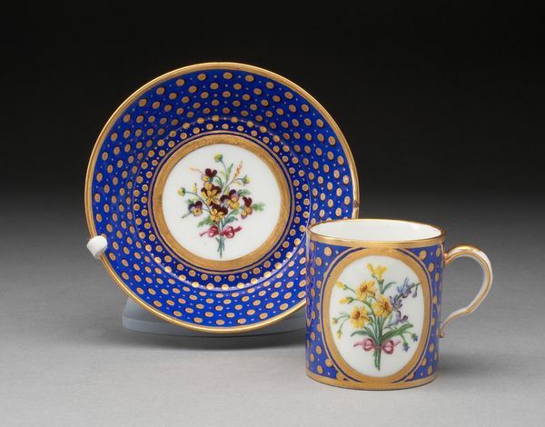 Editor: So, this is "Cup and Saucer," dating from the late 18th century and made by Manufacture nationale de Sèvres. It's crafted from ceramic and porcelain and currently resides at the Art Institute of Chicago. What strikes me is the opulence, almost excessive, and also the intense cobalt blue. What’s your take on this piece? Curator: The deep cobalt, indeed, acts as a grounding element amidst the floral abundance. Consider the persistent symbolism of flowers during this era; not mere decoration, but carriers of coded messages. Do you see how each blossom and fruit contributes to a larger narrative of ephemeral beauty and cultivated refinement? Editor: I see the floral and fruit details, but it almost seems like pure decoration, visually pleasing but...perhaps not *that* deep? Curator: Think about the culture that consumed from such objects. Each sip taken wasn't merely about quenching thirst. It was an act imbued with social meaning, signifying status and a connection to cultivated taste. The cup and saucer become silent actors in a social drama. What kind of dialogue might they enable? Editor: I hadn't considered that...like, using them was almost like a performance? And that maybe these images would signal the owner's refined appreciation of nature or art? Curator: Precisely. And notice the classical meander pattern around the base of the cup. It harkens back to antiquity, lending an air of timelessness and intellectual sophistication. Editor: So, it's not just a pretty cup; it’s a statement. A symbol. It represents a world of rituals, messages and carefully chosen symbols, meant to convey elegance. I definitely see the flowers and forms differently now. Curator: And that's how everyday objects whisper stories of their time.