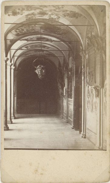 Curator: Mèdèric Mieusement created this gelatin silver print, titled "Kapel in het Hôtel de Cluny, Parijs" sometime between 1870 and 1890. Editor: Wow. The photo just drips with this somber, ancient beauty. It's all curves and shadows, spirals rising like secrets whispered through stone. There’s something otherworldly about it. Curator: Indeed. The Hôtel de Cluny, now the Musée de Cluny, houses France’s national collection of medieval art. This image offers a glimpse into the chapel. Mieusement was fascinated by the Middle Ages and his photographs often celebrated architecture rooted in this period, particularly its Romanesque elements. Editor: I can almost smell the damp stone and hear the echoes of chanting. It’s so atmospheric, isn’t it? The way the light catches the statue of the Madonna and Child... it's like they’re glowing. Gives it this strange feeling, you know, like you’re not sure what century you are standing in. Curator: Mieusement utilized photography to document and, in some ways, preserve buildings like these. Think about it: during the latter half of the 19th century, there was renewed interest in medieval architecture, a sentiment reflected in the Gothic Revival movement. This interest helped restore medieval buildings and increased cultural tourism. Mieusement's images acted as important historical records, but they were also designed to capitalize on the contemporary fascination. Editor: Makes sense. The way he composes it too. You have that crazy staircase spiraling upward into what seems to be just darkness, and that little sculpture on the right – she totally owns the whole photo, drawing the eye straight into it! Curator: There is no question the Hôtel de Cluny offered a dramatic architectural subject, one deeply infused with history, religion, and of course, France's artistic heritage. Mieusement, by carefully composing this view, placed himself within that legacy, almost solidifying the role that photography can play within national cultural identity. Editor: Absolutely, it does so much more than simply "document". For me, it whispers a beautiful poem. A haunting melody stuck in my head! Curator: I agree, there’s an evocative quality. Editor: A perfectly captured fragment, which hints at a larger, richer world, wouldn’t you say?