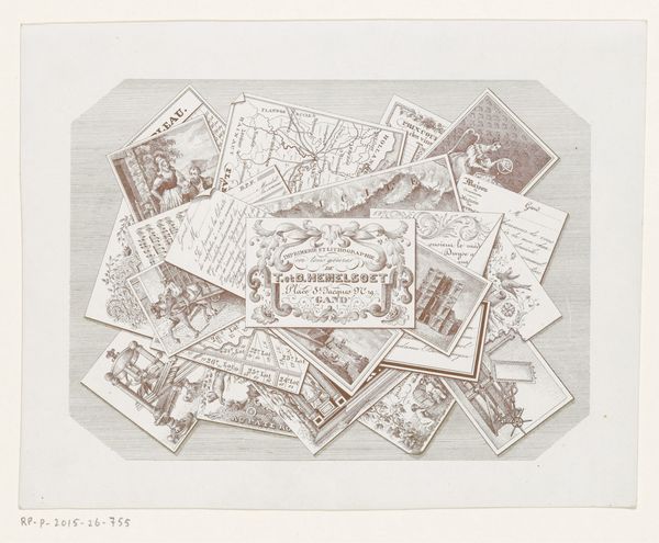 Curator: Let’s discuss this remarkable piece, "Bordspel De Hut van oom Tom," or "Board Game Uncle Tom’s Cabin." Created sometime between 1840 and 1851 by Nicolaas Charles Krone, this engraving with pen and ink is currently held at the Rijksmuseum. Editor: Whoa, heavy. Visually, it looks like a dark cloud settled over Candyland. All those little numbered vignettes hint at a journey, but the overall feel is oppressive. A game? Really? What was Nicolaas thinking? Curator: Exactly! The seemingly innocent format of a board game masks its problematic underpinnings. This game draws directly from Harriet Beecher Stowe's influential novel, and we must analyze how it participated in the reproduction of racist imagery and ideologies. Editor: Oh, it's not subtle, is it? I can almost hear the echoes of minstrel shows. Were people actually...enjoying this? It's so jarring seeing playfulness intertwined with dehumanization. Gives you the shivers, honestly. I feel like it would almost feel dirty to roll the dice on that...thing. Curator: And that’s the discomfort we need to confront. How does popular culture perpetuate stereotypes? How did "Uncle Tom's Cabin," despite its anti-slavery stance, become implicated in harmful representations of Black individuals? This board game becomes a tool for unpacking those painful questions. How could this, meant for child's play, normalize the atrocities that Black individuals experienced? Editor: Right, like some twisted form of "educational" toy... Looking closely, some of those squares depict fairly rough scenes. You almost forget this thing's framed as, you know, entertainment. Did folks at the time clock the weight of it all, or did it slip by wrapped in the guise of innocent fun? Curator: Contemporary audiences likely had varying perspectives, desensitized as many were to such imagery. However, studying this object today offers critical insights into the pervasiveness of racist tropes and their insidious embedding within everyday life. We confront it to understand that this is where the battle happens. Editor: It's a stark reminder of the era, and how easy it was to normalize the inexcusable. A pretty grim game of snakes and ladders. What a potent and uncomfortable artifact. Curator: Indeed. May we confront its unsettling nature to spark awareness for a future where it becomes incomprehensible.