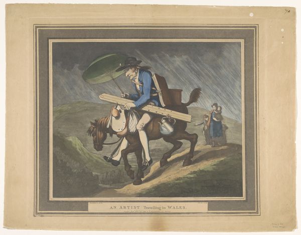 Curator: This print, "Doctor Syntax Sells Grizzle," dates to around 1812 and is by Thomas Rowlandson. The Art Institute of Chicago holds it. It combines etching and watercolor on paper. What springs to mind when you look at it? Editor: The whole scene bubbles with a mischievous energy! It feels like a fleeting moment plucked from a stage play, doesn't it? The colours, though faded now, hint at something vibrant, satirical perhaps? Curator: Satire is definitely Rowlandson’s hallmark. Let's consider the context. These prints, part of the "Tour of Doctor Syntax" series, were immensely popular, feeding a growing demand for illustrated social commentary. Cheap prints were an accessible commodity to an expanding middle class. Editor: So, beyond the story of Doctor Syntax – a parson with more enthusiasm than sense, I gather – Rowlandson's really holding up a mirror to English society, isn't he? A bit of gentle mockery, a touch of theatrical exaggeration... Curator: Exactly. Consider the caricatured figures; each pose and expression exaggerated to emphasize flaws. It reveals evolving class tensions and a certain level of commodification of virtue during this era, right down to the selling of a humble horse like "Grizzle". Look at the details in the architecture and clothing – all products, all purchasable. Editor: Absolutely. And that gives it such a delightful sense of the absurd. This moment of buying and selling. And it makes me consider the relationship between the artwork as an object and the culture it depicts. Was Rowlandson commenting on commercial transactions or was he only focused on its aesthetics? Curator: It's inseparable. Rowlandson critiqued a rapidly changing England through affordable prints made possible by industrial advances in paper production and etching. His artistry was deeply intertwined with economic accessibility. This speaks to the romantic aesthetic; embracing drama. Editor: In this scene, despite the hustle of bartering, there's a palpable loneliness, almost a yearning quality about those figures. Perhaps this is the magic of Rowlandson! It all makes one contemplate the idea that all commercial relations are not without emotional connection. Curator: A beautiful way to put it. He captured a society in transition with sharp observation and poignant emotion accessible to even those with limited means. Editor: Agreed, an object lesson on how commerce, commentary, and creativity converge.