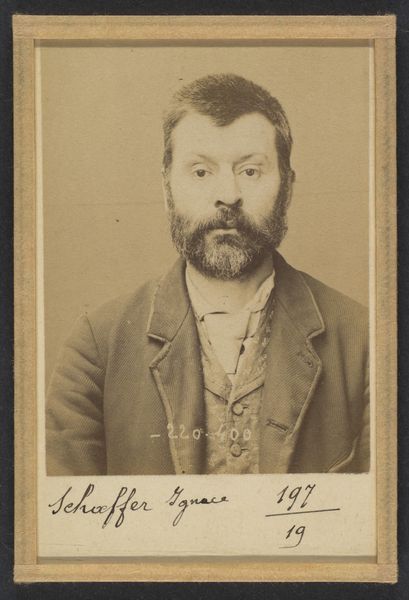 Curator: Good morning. Today we're looking at a piece titled "Pennelier. Casimir. Arthur. 36 ans, né à Billeuse (Somme). Clerc d'huissier. Anarchiste. 16/3/94." It's a daguerreotype, a photograph, made by Alphonse Bertillon in 1894. It resides here at the Metropolitan Museum of Art. Editor: A very direct portrait! I'm struck by how somber it is. It has that hazy quality of early photography that lends it a ghostly aura. It feels like a preserved fragment of a forgotten world. Curator: Well, Bertillon was using photography very scientifically here. He developed a system of anthropometry to identify criminals. So these images are documents, meant to record physical characteristics precisely. Our man Casimir here was deemed an anarchist. Editor: Right, so this isn't art in the traditional sense. It’s a tool of the state. And that adds another layer of melancholy for me, because the label “anarchist” carried heavy, often unjust, implications. Who was he really? A political firebrand, or just someone who questioned authority? Curator: Exactly! He might have been a romantic revolutionary or simply misunderstood. We only know what the police saw in him. Still, there's something inherently human in that gaze. He looks directly at the viewer, a little wary maybe. Editor: His neatly trimmed beard and respectable attire clash with the loaded term "anarchist". It complicates the narrative. It makes me think about how labels are used to dehumanize people, especially during periods of political upheaval. Curator: That’s what I find compelling too! Despite the attempt to categorize and control, Casimir retains a sense of individual dignity. This portrait unintentionally offers a glimpse beyond the rigid definitions. A clash of humanity and system. Editor: Precisely! Even within the confines of such a system, a ghost of humanity endures. It's a silent rebellion etched in silver. Thanks for shedding light on that. Curator: Thanks to you for noticing. Perhaps this daguerreotype is, after all, something of a ghost itself: a record of an instant but now holding so much more.