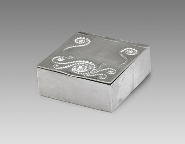 Editor: Here we have a tobacco box, dating back to 1748, crafted from silver and featuring a carved relief. The detailed scene on the lid immediately catches my eye—it almost feels like a tiny, self-contained world. What strikes you about this piece? Curator: Its form speaks volumes. Note the linear precision and geometric articulation. The box itself adheres to strict lines, emphasizing its function. This rectilinearity is subtly softened by the relief carving, isn't it? It presents a narrative—perhaps pastoral, perhaps allegorical. Do you see how the density of the carving guides the eye? Editor: I do, especially how the lighter areas draw you in despite the detailed scene, and it makes me wonder about the intention behind the scene itself. Curator: Consider the visual weight and contrast. The relief functions not merely as decoration but as an integrated component, heightening the overall form. This duality invites careful consideration of technique and craftsmanship. We cannot divorce meaning from materiality here. The silver both reflects and contains. The carving, so meticulously rendered, contrasts beautifully. Notice the scene has internal cohesion. What does that formal coherence suggest to you? Editor: Maybe it's about a controlled representation of nature? The contrast you pointed out also makes the landscape look expansive despite it all being contained in a small area. It's really interesting to think about this "control". Curator: Precisely. This harmony invites sustained contemplation of the relation between form and content. Through such formal readings, a work unlocks richer meaning. Editor: Thinking about the carving as an integrated component and focusing on its geometry gives me a completely different perspective. Thanks! Curator: Indeed. Considering the materiality and structure enriches our understanding of its artistry and the choices that make the work more interesting than we thought.