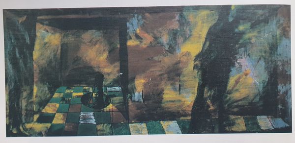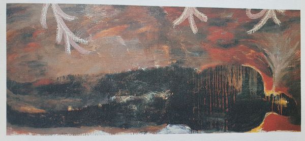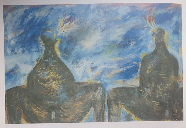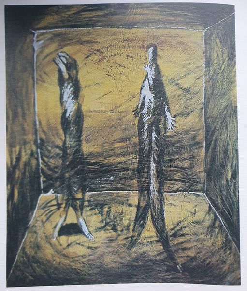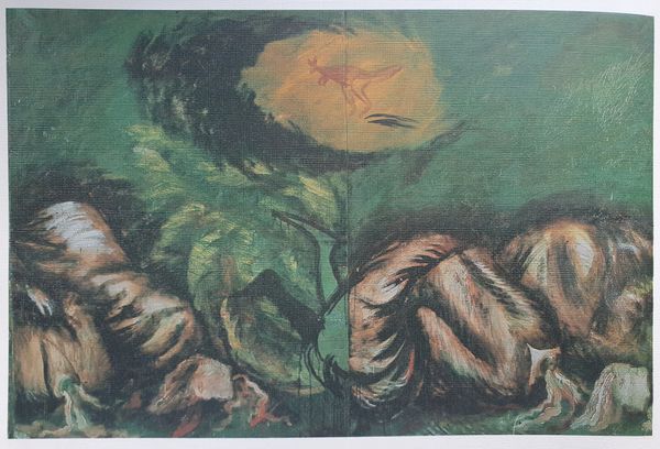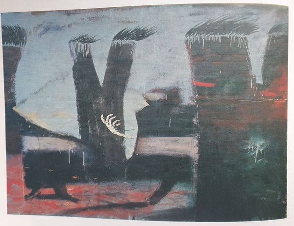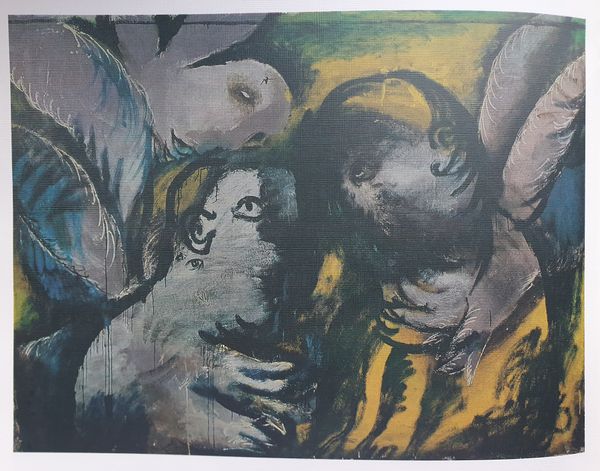 Curator: Let's discuss Oleg Holosiy’s intriguing painting from 1988, “Christmas card, from the series 'Pathetic Engeliade'”. Holosiy renders an image that on first glance presents figures resembling angels set against a darkly mottled ground. Editor: The somber hues and obscured faces convey an overwhelming sense of anxiety rather than any feeling of divine comfort one would normally associate with such subjects. The overall texture suggests a turbulent spiritual landscape. Curator: Precisely. The visible wood grain of the support serves as an undercurrent, contributing to the atmospheric perspective while subtly contrasting the smoothness usually desired in classical oil painting. What effect might Holosiy achieve through these painterly decisions? Editor: Given the social and political turmoil of the late Soviet era, especially the anxieties of impending changes of Perestroika, these figures might be symbolic representations of protection but also vulnerability. The repeated cross motifs evoke religious symbolism which, given the historical context, also carried layers of suppressed cultural identity seeking release. Curator: I appreciate the emphasis on context. Yet structurally, the mirrored symmetry is fascinating. Do you notice how the negative space is constructed, seemingly to create an area devoid of incident right around the faces of the two figures? Editor: I agree it does create an uncanny focus on them. But this ‘void’ effect you mention could also mirror the existential questions permeating art of the era in former Soviet Bloc countries as established political and spiritual narratives faced increasing disintegration. These aren't merely stylistic angels; they reflect broader crises within shifting societal frameworks. Curator: Indeed, by pushing the boundaries of iconographic representations, Holosiy makes viewers grapple with interpretations that exceed religious subject matter, focusing our attention more intently upon material composition and its effect within pictorial space. Editor: Through these angel-like figures and that raw canvas showing through the paint, we encounter powerful metaphors that address individual doubt during tumultuous eras while offering profound glimpses into changing belief systems and social tensions inherent in late 20th century existence.