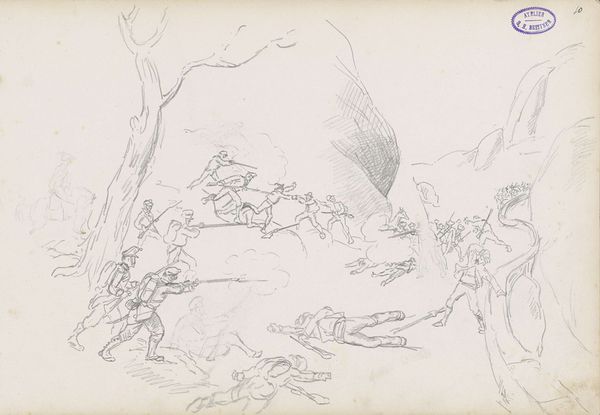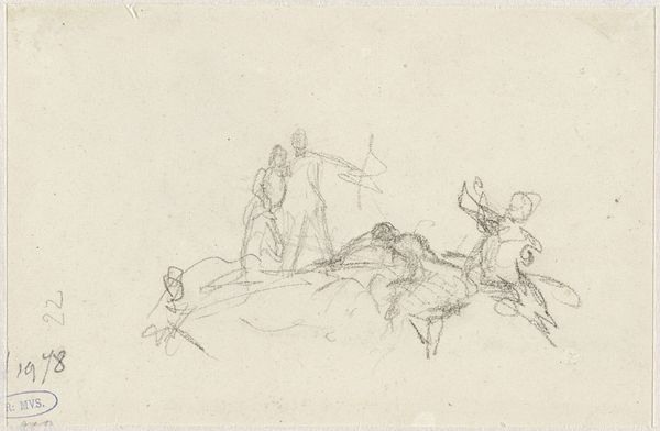 George Hendrik Breitner made this drawing, 'Hunters or soldiers with dogs in a forest', using graphite on paper. The light, almost ephemeral quality of the graphite lends a dynamic sense of movement to the scene. The material simplicity of graphite belies its significance. Graphite, a form of carbon, has been used for centuries due to its ready availability, ease of use, and erasability. In this sketch, Breitner skillfully exploits graphite's characteristics to create a sense of immediacy. Each stroke captures fleeting moments in the hunt, from the frenzy of the dogs to the focus of the hunters. The decision to employ such a humble material invites reflection on the social context of art-making. Breitner bypasses the preciousness of oil paint, democratizing artistic expression through this readily accessible medium. The drawing is not only a depiction of a hunt but also an exploration of the relationship between art, labor, and accessibility. Ultimately, it reminds us that the most profound art can arise from the simplest of means.