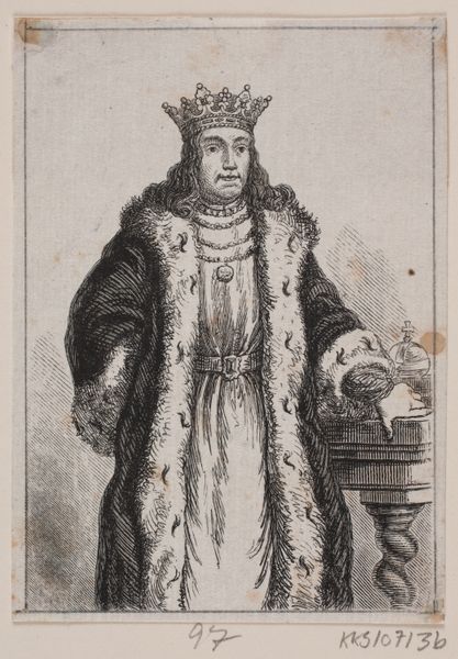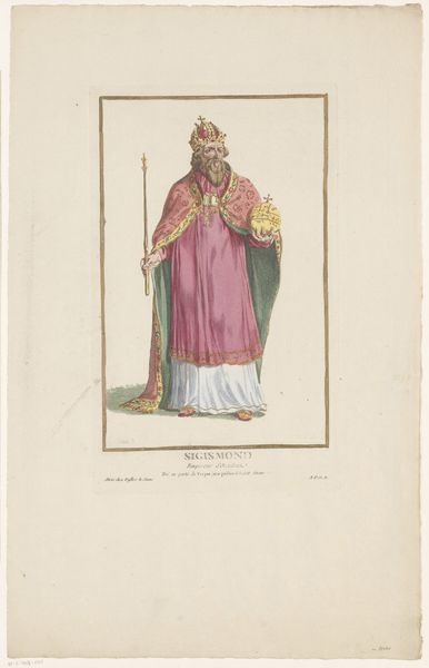 Curator: Here we have "Paus met tijdlijn van pauzen op zijn gewaad," which roughly translates to "Pope with a Timeline of Popes on His Robe," dating from 1727 to 1782. Editor: Whoa. Okay, my first thought? Information overload. My second thought? Fashion statement, papal edition! But in all seriousness, the robe covered in timelines...it’s bold. Curator: Bold is one way to put it. It's fascinating how the print, currently held at the Rijksmuseum, combines the portrait format with textual information literally woven into the Pope's garments. It's almost as if his authority is directly tied to the lineage he represents. Editor: It’s like he’s wearing his CV. Imagine trying to dry-clean that! All those tiny, tiny words…makes me wonder, was this meant as a genuine record or something more satirical? There's something slightly absurd about having the history of the papacy draped across his chest. Curator: That tension between reverence and potential satire is precisely what makes it so compelling. Consider the period: the Baroque era, where art often served didactic or propagandistic purposes, but also embraced elaborate ornamentation. Could it be both reverential and subtly subversive? Who was Emanuel Eichel aiming this towards, and what socio-political debates might it touch? Editor: Subversive Baroque! I love that. I see the academic context you’re creating, and it’s making me appreciate the art on a deeper level. But I still feel like there is so much going on. I suppose that I can only consider how visually striking it is when a person literally embodies history. It's quite powerful! Curator: Indeed. I would suggest taking some time with the artwork’s layering of visual and textual elements; it's a potent commentary on power, legacy, and representation. Editor: Yes! Now when I leave, I’ll reflect on the way that fashion makes a statement… Thanks to this, I now realize how deep a garment's roots can go.