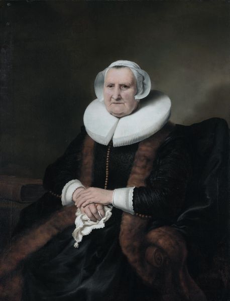 Curator: Looking at Ferdinand Bol's "Portrait of An Old Woman" from 1640, I'm immediately struck by the woman's penetrating gaze. Editor: Yes, her eyes convey such a weight of experience. It's almost melancholic, but there’s a stoicism as well. The composition is quite formal, though softened by the handling of light. Curator: Bol painted this during a period of increasing demand for portraits among the Dutch middle class. The sitter's clothing suggests she's a woman of some means, probably a burgher's wife or widow. Portraits like this affirmed social status. Editor: I see it also as a visual encoding of memory. The white cap she wears immediately recalls imagery of the pious, older woman. Her hands clasped so firmly perhaps symbolize resilience, endurance through life's hardships. We see her almost as a matriarchal figure, despite the individual qualities of the portrait. Curator: Absolutely, the clothing signals a social role, and these conventions were highly codified. Yet Bol manages to bring a remarkable degree of individual character to the depiction, differentiating this from a generic representation. The National Museum in Warsaw, where it resides now, reflects the shifts of cultural property across Europe. Editor: What intrigues me is how these images operate on multiple levels. The black attire, a symbol of austerity in certain contexts, simultaneously blends into the dark background. Her face becomes the focal point. It's as if time itself is etched onto her skin. Each wrinkle and line tells a story. Curator: The commissioning of such a portrait also served specific purposes for the sitter and her family. Beyond being a commemorative piece, these portraits solidified family lineage and served as visual reminders of their place within the social order. They actively shaped and reinforced social identity. Editor: Right, we’re not just seeing a likeness. We’re encountering an intentional construction, steeped in symbolism. Bol's skill lies in subtly communicating this woman’s essence while fulfilling the demands of portraiture. It's that intersection that keeps these images so resonant. Curator: It is that delicate interplay between the individual and the societal frameworks in which they operated. It’s a valuable testament to how portraits reflected and perpetuated specific historical norms. Editor: A fascinating blend of individual story and cultural narrative captured in a single image.