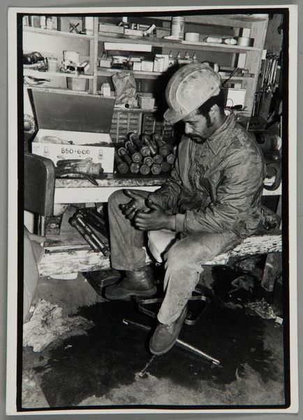 Robert Frank took this photograph in 1953 in Caerau, Wales, using black and white film. The monochrome palette emphasizes the grit and texture of the scene, a sort of visual correlate to the harshness of the miner's life. What strikes me is the subject’s stance – head bowed, focused intently on something in his hands, maybe a cigarette or a small note. The surface of the print itself has a kind of granular quality that echoes the coal dust on the miner’s skin and clothes. Look at the way his coat hangs, heavy and worn. There's a world of weariness in that drape. Frank’s work always makes me think of Walker Evans, especially in their shared dedication to documenting everyday life with such stark honesty. But where Evans is more detached, Frank feels rawer, more personal. Ultimately, it’s the ambiguity that stays with you: this man, this moment, caught between labor and something else, something private.