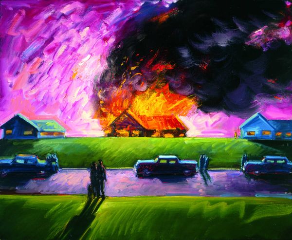 Kent Monkman, born in 1965, created this painting, "Struggle for Balance," to address complex issues within contemporary society. He combines historical and mythical elements with scenes of modern life, inviting us to consider how the past shapes our present. Monkman, who is of Cree ancestry, often integrates figures from classical art history into his work. Here, they appear amidst a chaotic scene of a car on fire, people fighting, and a bear being restrained. This juxtaposition challenges traditional representations of Indigenous people, who have often been marginalized or misrepresented in art. The "Struggle for Balance" evokes the tensions between different cultures and the ongoing struggle for justice and recognition. The artist asks us to reflect on the emotional and personal dimensions of these societal issues. Monkman’s work ultimately calls for a re-evaluation of historical narratives and a recognition of the diverse voices that make up our collective story.