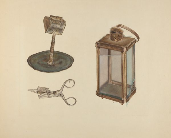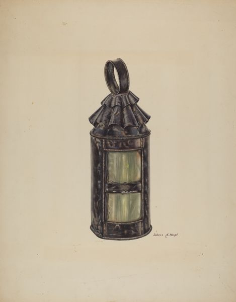 Editor: We're looking at Arthur Mathews' "Lantern," likely created around 1938. It appears to be a drawing, perhaps using charcoal and toned paper. It's such a detailed depiction of an everyday object. What strikes me is how functional and even beautiful the artist has made this seemingly mundane lantern. How do you interpret this work in its historical context? Curator: The choice of subject matter immediately interests me. Lanterns, while utilitarian, played a crucial role in daily life before widespread electrification. Consider the era: the late 1930s, still within the shadow of the Great Depression, with societal shifts driven by technology looming. Depicting a lantern, then, may subtly critique the burgeoning age of artificial light by glorifying craftsmanship and reliance on older means. The drawing becomes a historical document, reminding us of a fading past and perhaps quietly protesting against the social changes wrought by modernity. Do you notice any signs of use? Scratches, maybe? Editor: I do see some slight imperfections, perhaps wear and tear. That detail, as you mentioned, lends a very tangible, real feel to it. I wouldn’t have picked up on the connection to societal anxieties about technology. I assumed its simple, unassuming mood. Curator: Precisely. The drawing elevates this common object, imbuing it with significance, transforming a simple utility item into a cultural artifact. Think about where such an image might be displayed and for whom? How might it challenge the expectations in 1930s exhibitions? Editor: I see your point. It would really disrupt typical exhibition narratives by honoring an everyday item instead of idealizing something aspirational. Thanks, I’ll definitely keep these issues of context in mind. Curator: That kind of contextual consideration transforms viewing art, doesn't it?