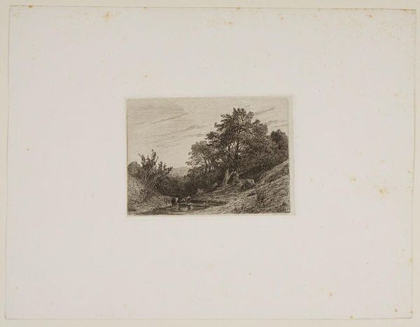 Curator: This is "Landscape" by Célestin Nanteuil, who lived from 1813 to 1873, currently residing at the Harvard Art Museums. Editor: It's quite somber; the stark contrasts create a rather melancholic mood, don't you think? Curator: Indeed, and Nanteuil was working during a period of great social upheaval in France. Consider the rise of industrialization and its impact on rural life. Editor: The tonal range is impressive. Look how he uses light and shadow to create depth, especially in the rendering of the trees. Curator: The landscape genre often served as a commentary on man's relationship with nature, and this piece is no exception. It's a reflection of his time. Editor: I’m drawn to the rhythmic repetition of forms—the rolling hills echo the shape of the clouds; it’s cleverly balanced. Curator: It's fascinating how art encapsulates both the aesthetic sensibilities and the societal concerns of an era. Editor: Absolutely. It encourages me to look again at how we frame and understand landscapes today.