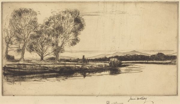 David Young Cameron created "On the Wye at Haddon" using etching, a medium known for its intricate lines and tonal subtleties. The composition is dominated by a serene landscape, where the River Wye meanders through the scene. Cameron employs a structural juxtaposition between the natural and the man-made, evident in the stark silhouette of a castle against the softer, organic forms of trees and rolling hills. The bridge, with its rhythmic arches, acts as a semiotic device, connecting different segments of the landscape and inviting the viewer's eye to traverse the pictorial space. The linear quality of the etching technique lends itself to a detailed rendering of textures, from the foliage to the subtle gradations of light across the water. This attention to detail does not merely replicate nature but rather constructs a visual language through which Cameron articulates a poetic interpretation of the landscape.