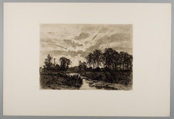 Curator: Before us is Alfred Alexandre Delauney's "Landscape with a Stream." Delauney, who lived from 1830 to 1894, captures an evocative scene. Editor: It's quite moody, isn't it? The etching technique lends an almost somber tone to the landscape. There’s a stark contrast. Curator: Indeed. The high horizon line focuses our attention on the sky, where Delauney manipulates light and dark to create depth. Note how the hatching mimics the effect of sunlight breaking through cloud cover. Editor: And considering the burgeoning industrial revolution, it seems like a deliberate rejection of urban life, a return to an idealized rural past. Curator: Perhaps. Or perhaps it's a meditation on the transience of natural beauty, given the atmospheric effects he so meticulously renders. Editor: Ultimately, Delauney offers a space for reflection. Curator: Precisely, a moment captured.