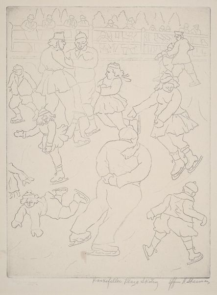 Curator: Alright, let's talk about this piece titled "Carousel Central Park," a print by Effim H. Sherman, dating roughly from 1935 to 1943. What strikes you first? Editor: A peculiar emptiness. It's like the ghost of a joyful scene, the sketched lines implying motion, yet somehow frozen. A hesitant dance on the verge of chaos. Curator: Precisely! Sherman's use of line is very evocative here. There's a sense of fragility to it. It doesn't quite delineate every form; rather it suggests it, leaving something to the imagination. Look at how the faces are merely outlined! Editor: Yes, that linear style emphasizes the mechanical repetition inherent in a carousel, right? The same circular path, the same fixed smiles on the wooden horses. Curator: It also reflects, I think, the disquiet many artists felt during that time. The country was clawing its way out of the Depression, and another world war was brewing. There is something subdued despite the obvious theme of childlike play and joyful ride! Editor: You can certainly read that unease in the sketched hands below—they look almost like they’re reaching out for something just beyond reach. What I find particularly clever is the lack of color. It focuses you on form, rhythm, the bones of the scene. The linear scaffolding, so to speak, is the real subject. Curator: Definitely! And the use of print as medium! So repeatable! Just like life’s routines, you could say. Editor: This work encapsulates, for me, the tension between reality and its representation, joy and the void beneath, form and formlessness. What do you take away from it all? Curator: Well, for me it is a reminder that even the most cheerful facades can mask complex, profound anxieties. It's a beautiful testament to the power of suggestion.