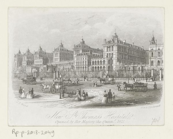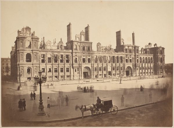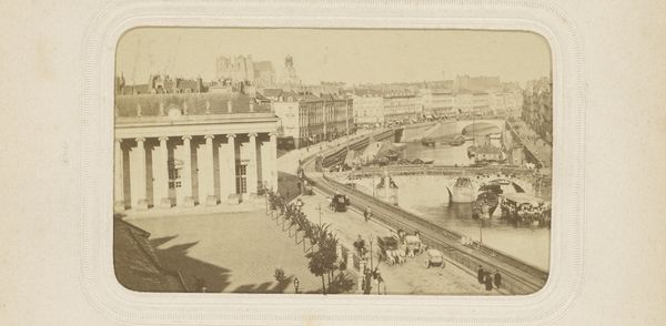 Curator: Sober and a touch melancholic, I’d say. Almost like a stage set before the play begins. Editor: This is a gelatin silver print, captured between 1889 and 1900, and titled "View of the Central Station from the Southwest with Men with Handcarts in the Foreground" by Andries Jager. Curator: Ah, the bare bones of the magnificent Central Station, before the throngs of travelers animated its halls! Look at the stark contrast between the skeletal metalwork and the heavy brickwork alongside it. The station seems incomplete, yearning for purpose. Editor: The emphasis here, to my eye, is the materiality of labor. These handcarts become extensions of the men; the city infrastructure's dependence on their muscle becomes apparent. The artist emphasizes a sense of industry—the making of Amsterdam—through highlighting its construction, with social undertones around labour and economics. Curator: Do you think it sentimentalizes that labour? Because for me, the symmetry created by the repeated carts— almost a silent, ordered rhythm—tempers the potential bleakness. The image has a formal quality, the dirt roads turned almost theatrical. Editor: That’s a great point. Consider that this print could have circulated commercially as part of a campaign to showcase Amsterdam’s modernity. The handcarts, while signifying manual labor, are meticulously organized and well-maintained, which hints at the era’s broader societal efforts toward organization and perhaps glorifying progress itself. The consumption of this very image perpetuates these systems. Curator: Yes! And from my perspective, this photograph also serves as a snapshot of potential— a collective exhalation anticipating a transformation that's so close it's palpable. I appreciate Jager turning urban growth into something contemplative. Editor: Seeing the railway in this image through the context of industry, class and photographic dissemination...it brings up really challenging questions on representation. I now look at this print with more informed insight. Thank you for your artist take, Editor! Curator: Likewise! It has been an interesting point of view from the materialist standpoint. A captivating dance, truly.