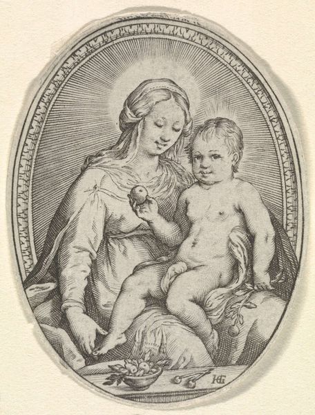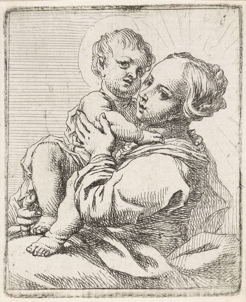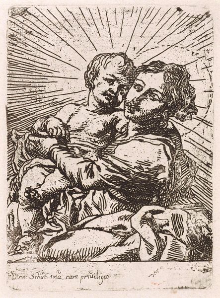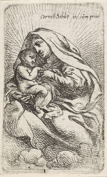 Editor: So here we have Cornelis Schut's "Madonna met Kind" from somewhere between 1618 and 1655, housed here at the Rijksmuseum. It’s an etching, a print. It strikes me as quite intimate, almost a tender moment captured with stark lines. How do you see this work? Curator: Ah, yes, a piece brimming with an almost fierce, whispered love, wouldn't you agree? The etched lines, aren't they fascinating? They aren't delicate, they aren't soft; rather, they feel urgent, passionate. I imagine Schut hunched over the plate, each scratch a declaration. Notice how the hatching creates not just shadow but almost a vibrating energy around them both. Does that resonate with you at all? Editor: Definitely. I hadn't thought about it that way, but the "vibrating energy" is a good description! I was so focused on the line work, which is so different from paintings of the Madonna and Child. Curator: Precisely! It lacks the opulent colours of typical Baroque Madonnas, doesn’t it? It forces a focus on the raw emotion, that very human connection. Schut distills the story to its core elements – motherhood, divinity, love… Does it make you consider the function of religious imagery perhaps in a more accessible light? Editor: Absolutely. It’s less about divine grandeur and more about human connection. Thanks! Curator: A delightful shift in perspective, isn't it? Makes me think we’ve both gazed upon this sacred bond with fresh eyes today.